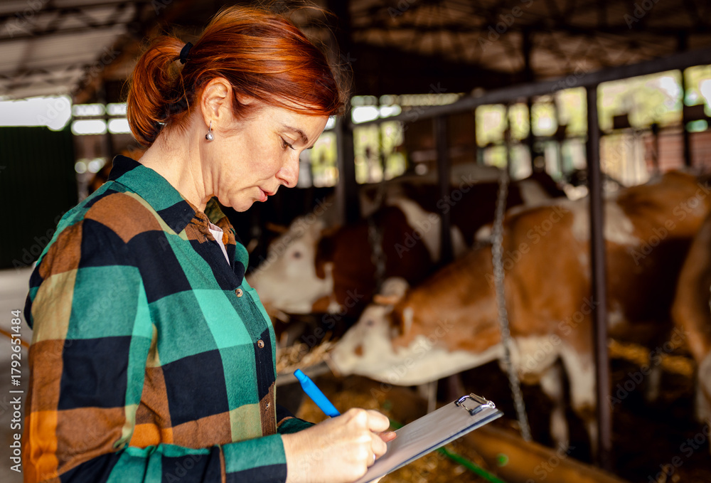 Female farmer managing a cattle barn with a male worker, making notes on clipboard.