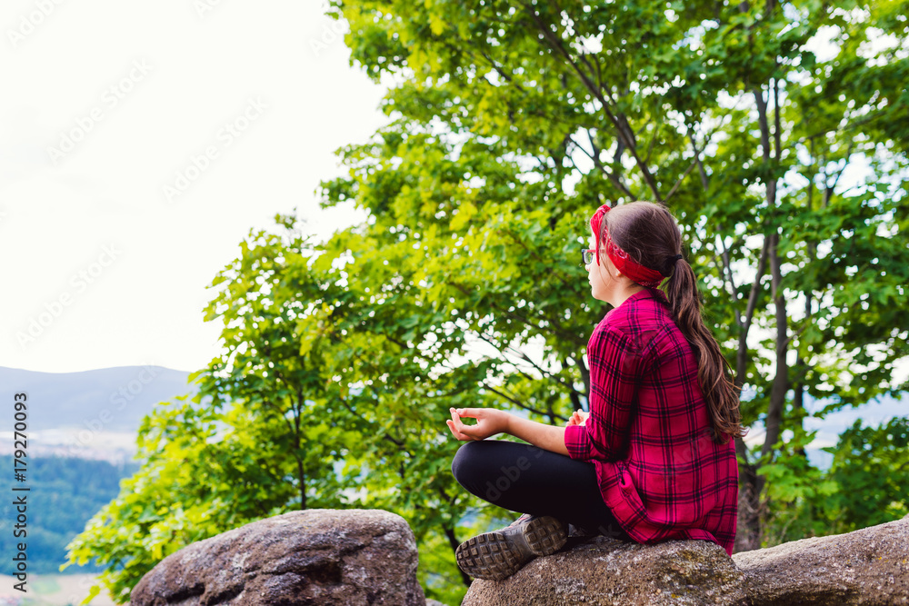 Healthy young hiker girl relaxing on mountain in yoga pose, healthcare lifestyle of good living concept