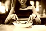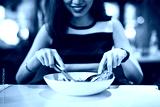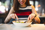 Happy woman eating breakfast vegetarian bowls healthy food menu with beans bread toast. Background at indoor restaurant on day. City people lifestyle on weekend concept.