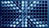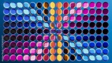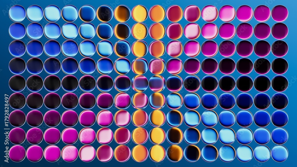 Glass spheres form a starburst rainbow effect with alternating colored rows, vibrant and glossy. 3d render illustration.