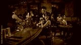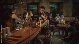 Laughing guests in vintage fashion enjoying cocktails and social moments at the bar. Concept of bar promo, nightlife content, luxury alcohol campaigns, event marketing, and social lifestyle visuals.