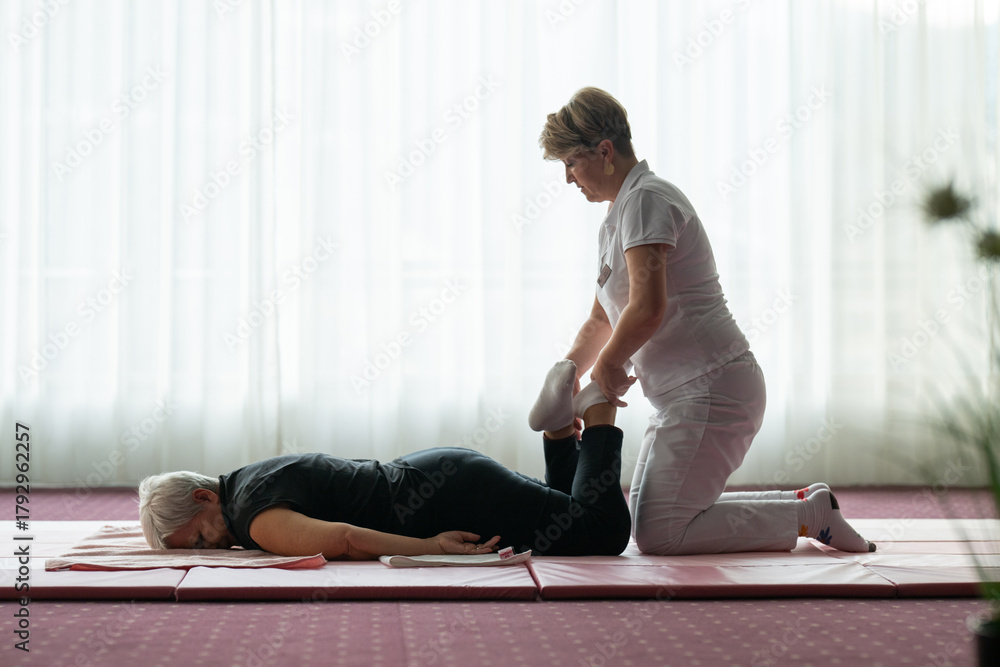 Professional female physiotherapist helping an older woman stretch her legs while lying face down on a mat. Rehabilitation and physiotherapy concept focusing on mobility recovery, flexibility, and