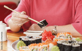The best sushi rolls, Japanese cuisine. Various delicious sushi rolls. The hand is dipped in soy sauce,