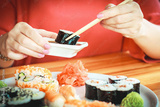 The best sushi rolls, Japanese cuisine. Different delicious kinds of sushi rolls. Cooking. The hand is dipped in soy sauce,