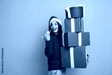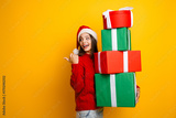 Playful Santa helper carries a tower of colorful gifts with a festive smile against a bright yellow background