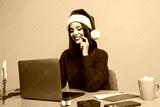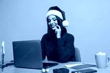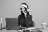 Funny festive Santa girl works from home on holiday season smiles at laptop wearing red sweater and hat while desk is decorated with gifts and warm cocoa