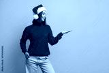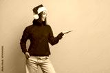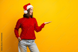 Cheerful santa hat wearing girl in a red sweater stands against a bright yellow background presenting a friendly open palm gesture suitable for holiday campaigns and festive lifestyle visuals