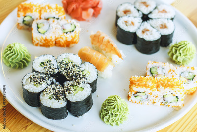 The best sushi rolls, Japanese cuisine. Different delicious kinds of sushi rolls.