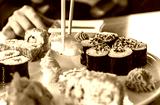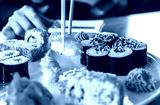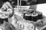 sushi and rolls, Japanese cuisine, a girl eating sushi