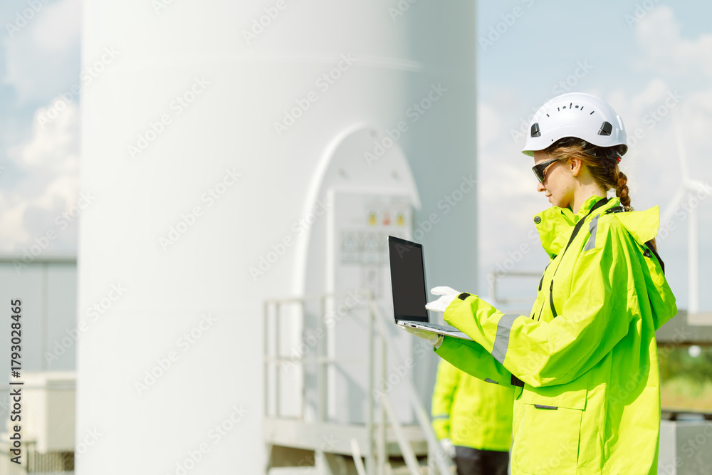 female engineer working outdoor with safety at wind turbines clean energy power station background.