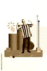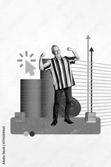 Vertical art trend collage of happy businessman show biceps receive dollar currency income keypad buttons usd capital profit