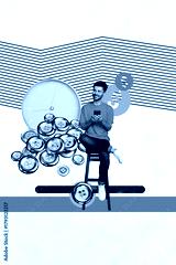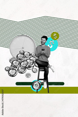 Exclusive image vertical photo collage of happy businessman receive dollar jackpot hold phone time deadline button income