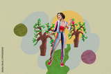 Image pop banner 3d photo collage of happy girl guy stand plasticine tree decor spring summer walk international holiday