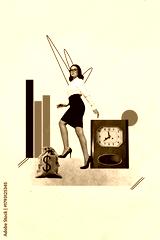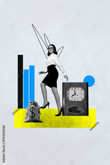 Vertical trendy magazine photo collage of happy businesswoman businessman stand arrow development dollar bag deadline time