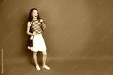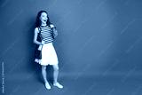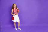 Young woman in a red striped top white skirt with red bag holding cup against purple background smiling and stylish casual fashion shot