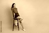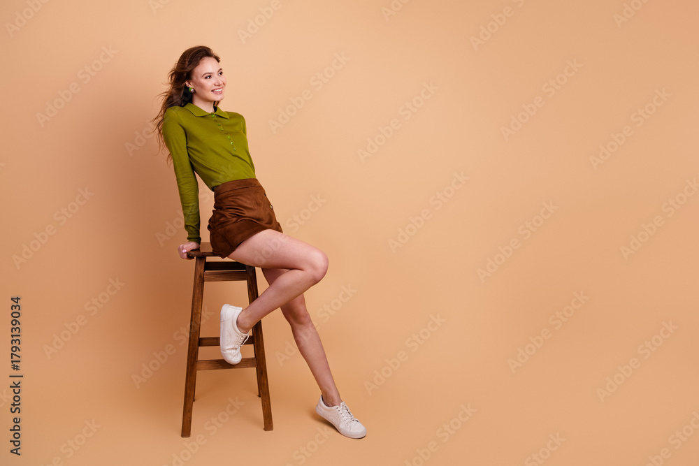 Casual chic young woman sits on a wooden stool against a beige background wearing green top brown shorts and white sneakers smiling in a lifestyle fashion