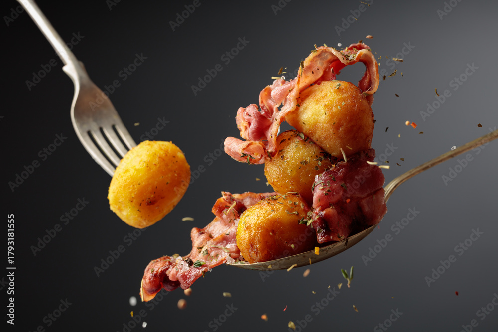 Roasted potatoes with bacon sprinkled with sea salt and spices.