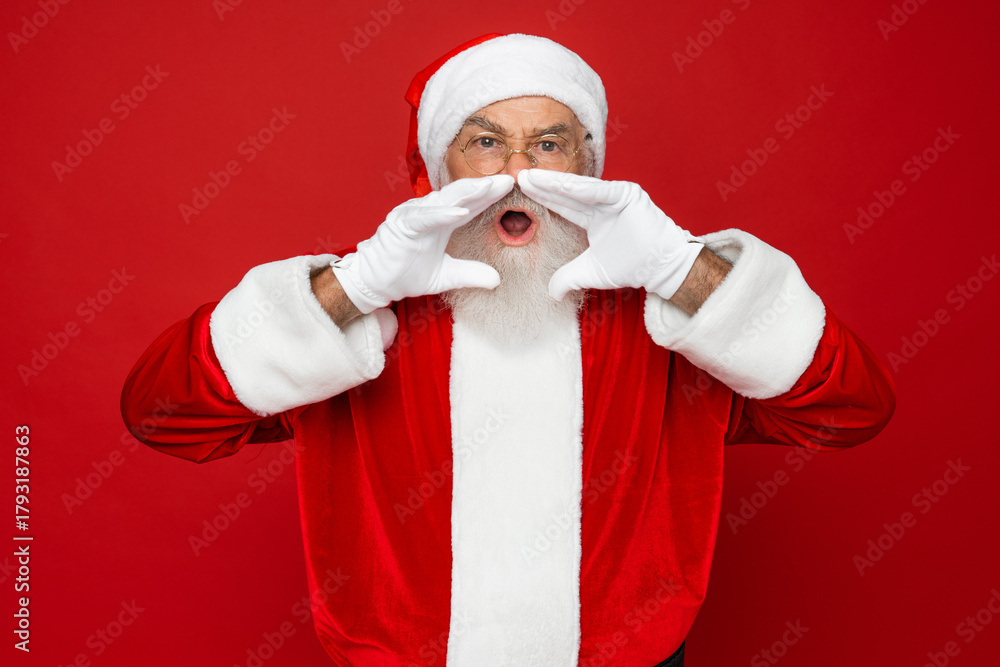 Winter noel sale discount reactions emotion concept. Stylish Santa white beard in costume headwear spectacles scream with open mouth staring eyes hear incredible news isolated on red background