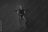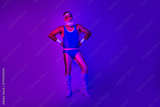 Retro fitness man in blue jumpsuit poses confidently under vivid purple neon lights for dynamic lifestyle image