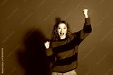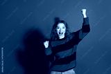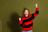 Young woman celebrates in red and black striped sweater energy and joy against olive background