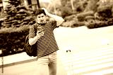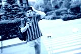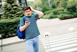 Young man walking in an urban park, concerned while checking his phone surrounded by daylight and surroundings