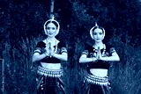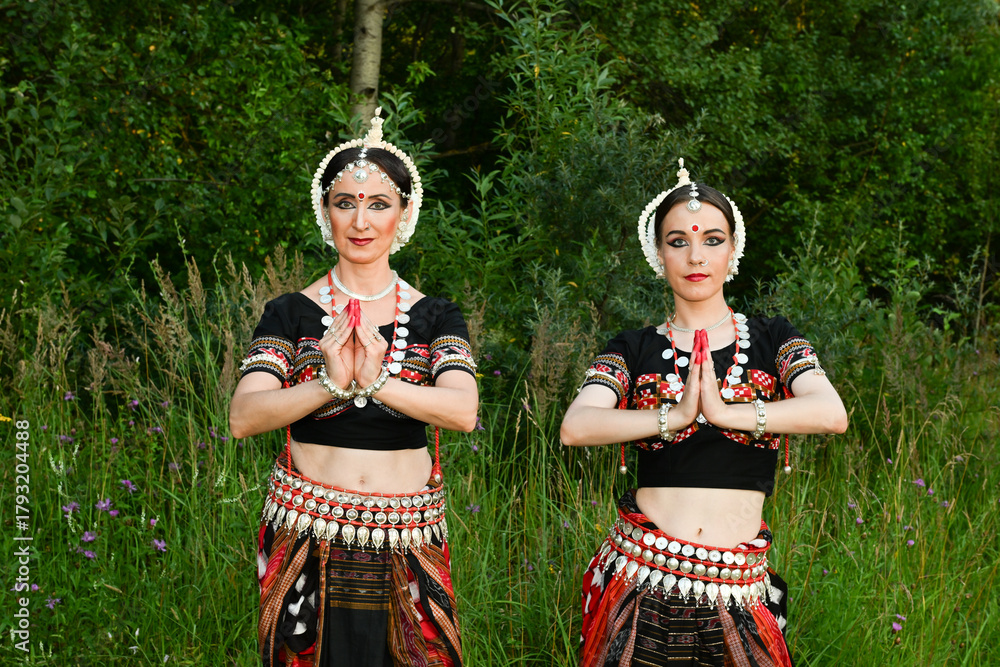 Indian female dancers in beautiful costumes on a green background of nature in a park in dance poses
