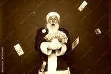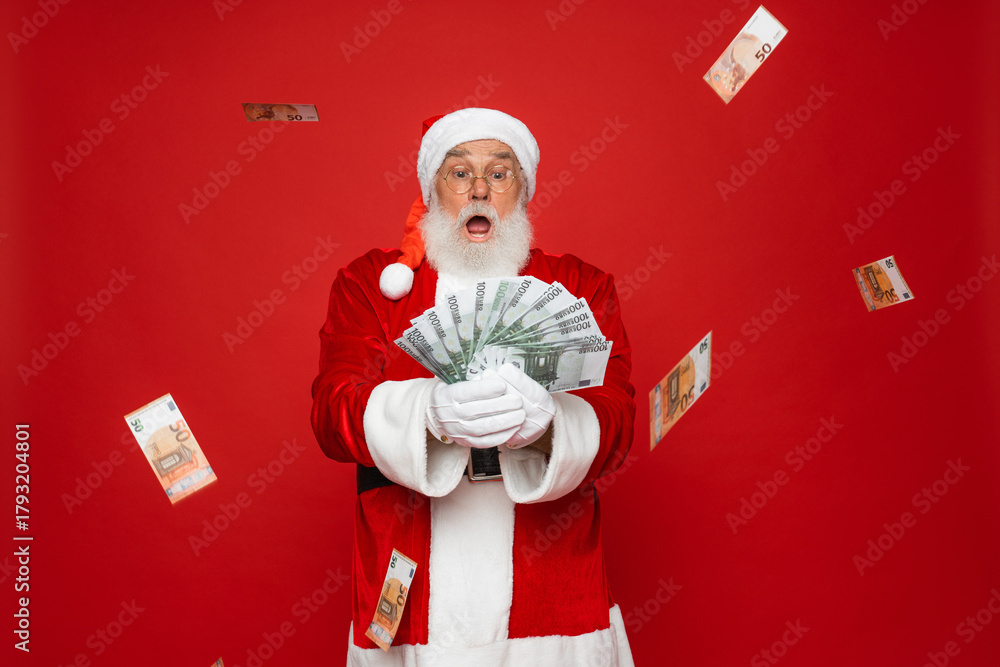 Photo of pensioner old man grey beard raise fists open mouth money shower hold cash wear Santa Claus traditional costume red coat hat standing isolated red background