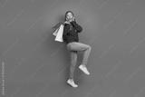 Adorable and cheerful young woman holding shopping bags while posing against blue background