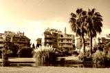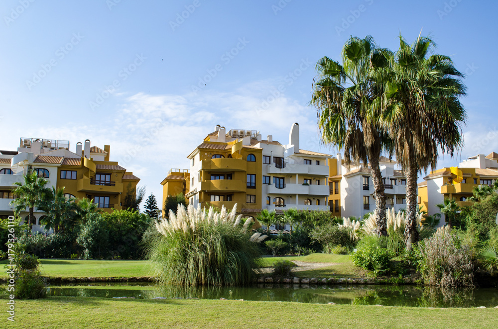 A small park with palm trees, bushes, tall grass and a shaved green lawn in a residential area with multi-storey yellow Spanish houses of the Punta prima in Torrevieja, Spain. A great place for summer