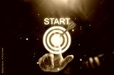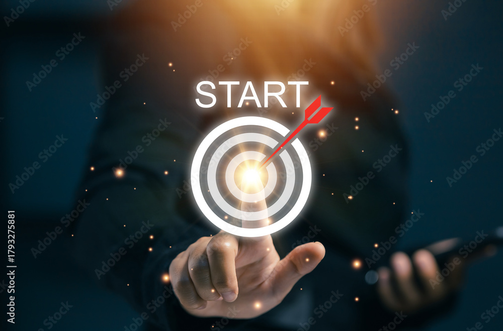 Finger touching start target icon with arrow hitting the center. Concept of goal setting, motivation, business start, and achieving success in digital marketing.