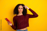 Young mixed race woman with red smartphone posing against yellow background wearing a burgundy sweater casual fashion and lifestyle