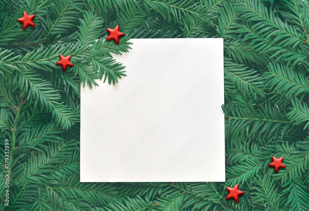 Creative background of pine branch with white paper card. New Year and Merry Christmas Concept.