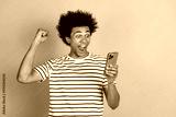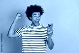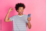 Young man celebrating success while using smartphone against pink background in casual striped t-shirt, exuding happiness