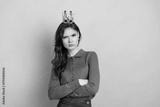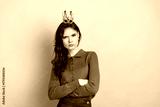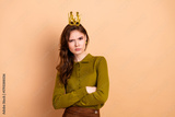 Young brunette woman wearing a crown stands confidently against a beige backdrop for fashion and lifestyle advertising