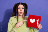 Young woman with surprised expression pointing at a red box with heart icon on purple background