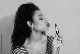 Young woman affectionately holding and kissing a lipstick against a vibrant yellow background, celebrating beauty and style
