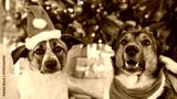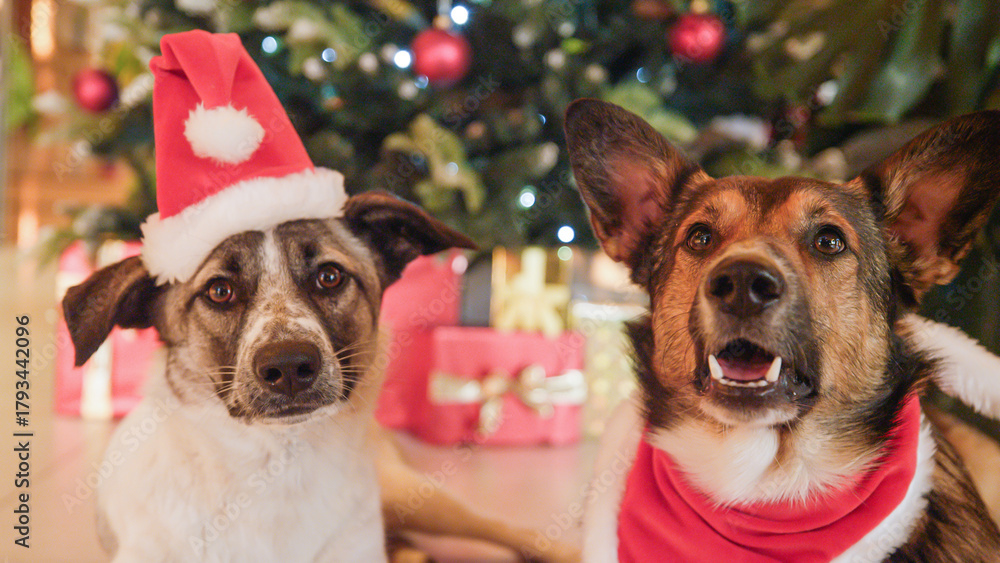 PORTRAIT, CLOSE UP: Santa dogs posing by the glowing Christmas tree and wrapped presents. Two adorable mixed breed pets in festive attire in the embrace of a heartwarming December holiday atmosphere.
