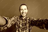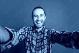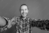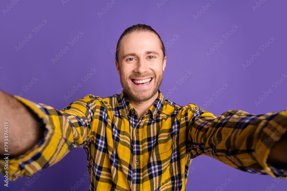 Smiling young handsome guy in casual checkered plaid shirt takes a selfie against a purple background showcasing fashion model