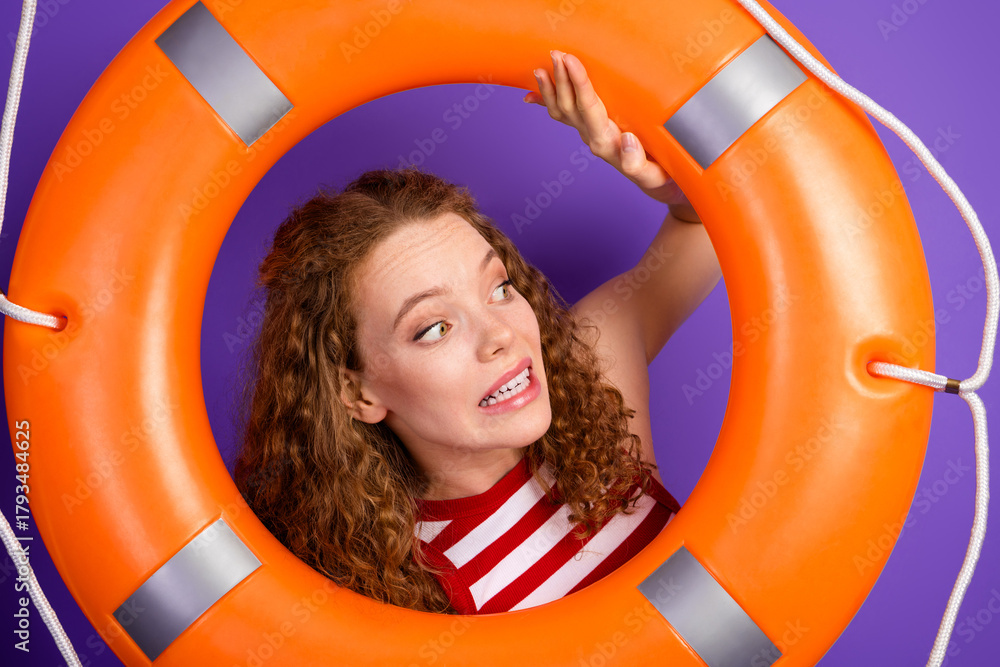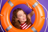 Young woman with orange lifebuoy poses playfully against purple background for a fun summer lifestyle photo shoot featuring fashion style and cheerful expression