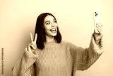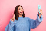 Young woman taking a selfie with a blue phone while smiling and showing peace sign against pink background
