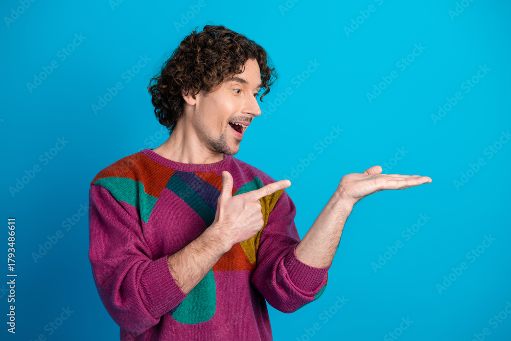 Young man in a colorful sweater presents an open hand gesture against a bright blue background