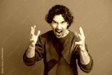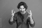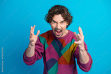 Man in colorful argyle sweater shouts with hands raised against blue background conveying bold emotion and playful fashion vibe
