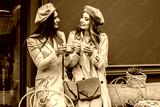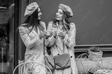 Spending good time with best friend. Horizontal shot of two beautiful women in berets looking at each other and smiling while drinking coffee outdoors of french vintage cafe. Attractive french women.