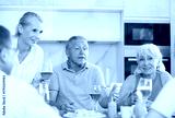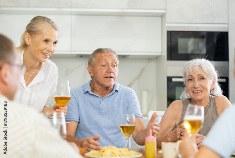 Group of joyful elderly women and man gathered around cozy kitchen table, chatting amiably while drinking beer and wine with snacks. Concept of socialization of older adults