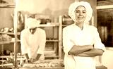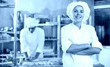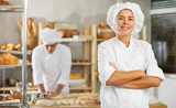Portrait of happy female baker in uniform in interior of a private bakery kitchen