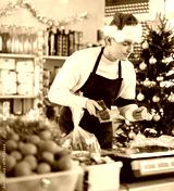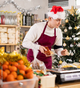 Seller in a Santa hat offers products to choose from. Buying delicious food for a festive dinner for the New Year. Christmas supermarket with fresh fruit