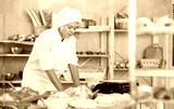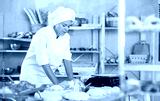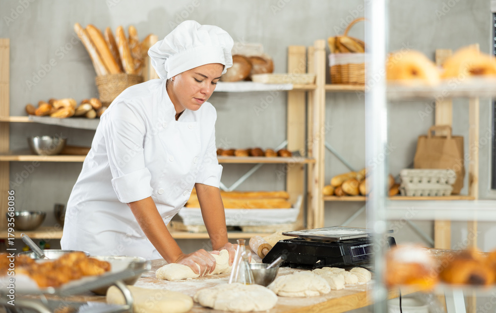 Baker girl in white uniform and chefs hat stretches piece of dough into long sausage, forms blank for baking baguette, sprinkles flour on dough.