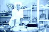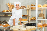 Calm smiling young female baker in white uniform leaning on floured table, enjoying short break while preparing dough in small, well-organized bakery, surrounded by fresh baked goods and tools..
