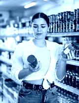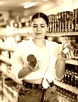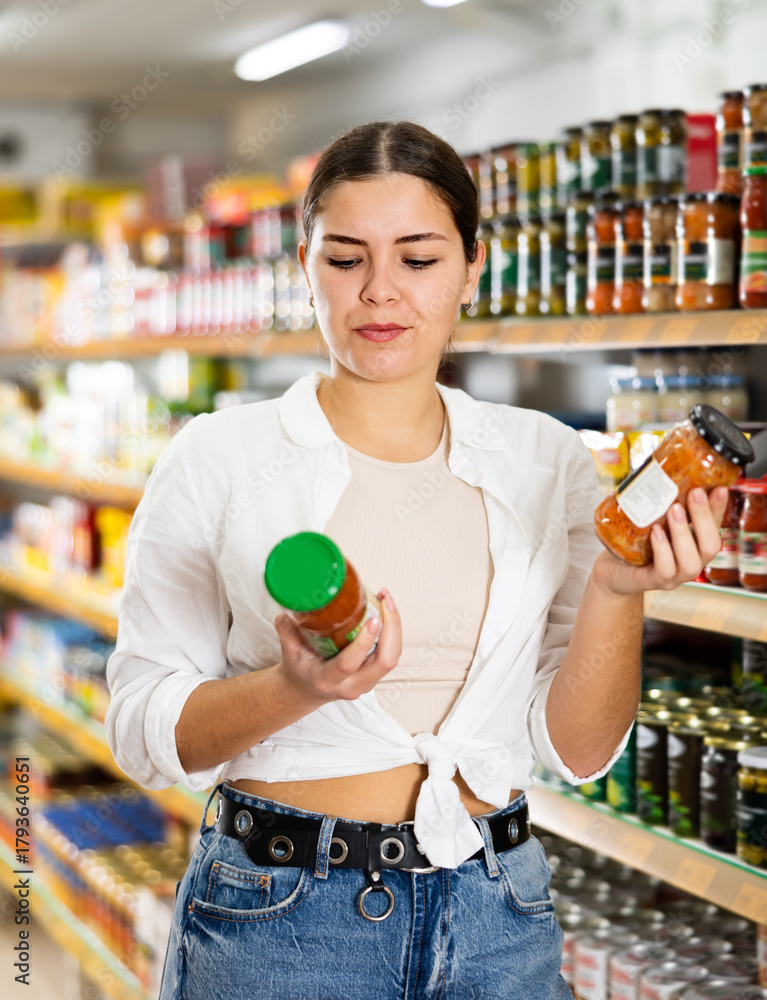 young woman came to canned vegetables department. Girl chooses between jar of canned carrots and peppers