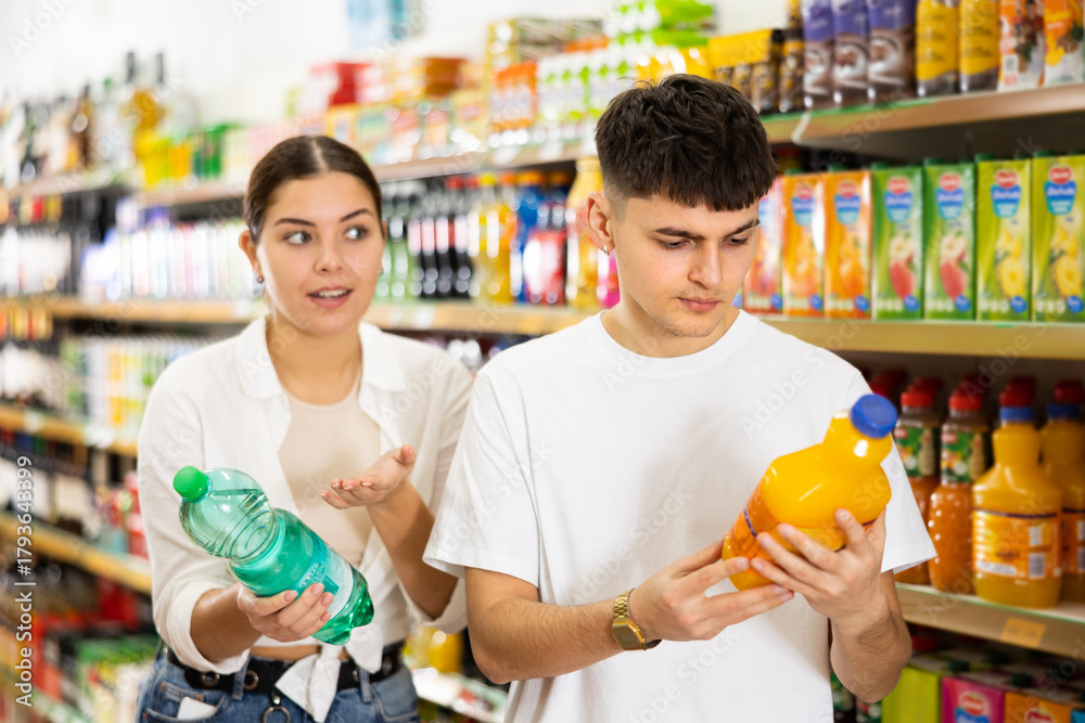 Young girl shopping together with boyfriend in supermarket, choosing sweet fruit juices and reading labels on bottles with interest
